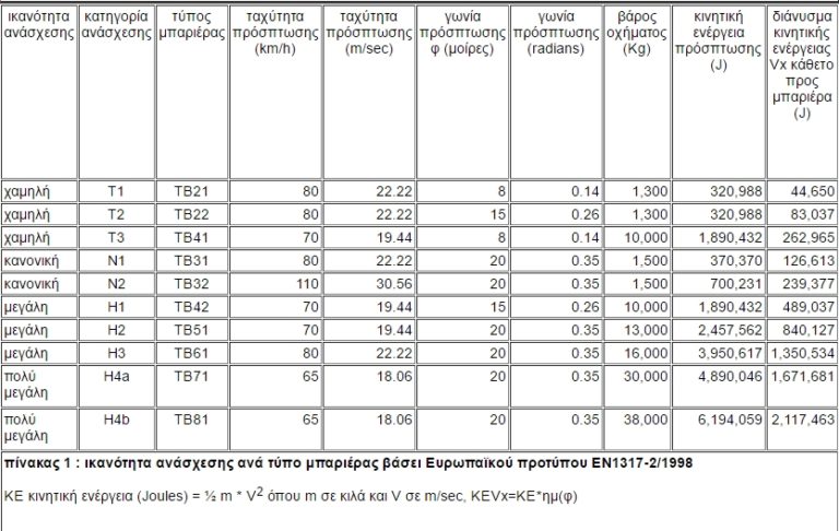- την κινητική ενέργεια του λεωφορείου για πρόσπτωση σε μπαριέρα με ταχύτητα 86.5 χλμ/ώρα, γωνία 20 μοιρών και μικτό βάρος 16,000 κιλά με αποτέλεσμα τα 1,578,911 Joules ενέργειας με κάθετη φορά προς την μπαριέρα