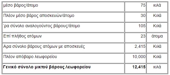 Το λεωφορείο που εξετάζουμε, μπορεί να ζυγίζει σε μέγιστη φόρτωση 16,000 κιλά δηλ. 10,000 κιλά απόβαρο και 6,000 κιλά ωφέλιμο φορτίο. Κατά το συμβάν είχε βάρος 12,415 κιλά που υπολογίστηκαν ως εξής: