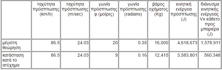 Η επαφή του λεωφορείου με τις μπαριέρες έγινε υπό γωνία κατά τι λιγότερο από 9 μοίρες.