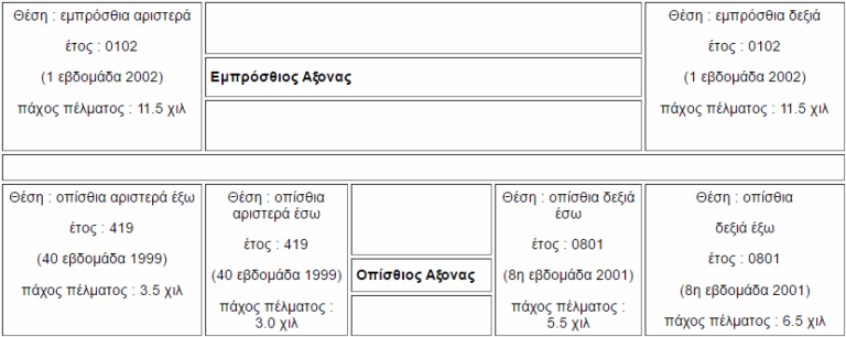 Η διαφορά της ημερομηνίας κατασκευής των δύο οπίσθιων ζευγών μεταξύ της 40ης εβδομάδας 1999 (δηλ. Οκτώβριος 1999) με την 8η εβδομάδα 2001 (δηλ. Φεβρουάριος 2001) είναι λίγο παραπάνω από έναν χρόνο (1 χρόνο και 4 μήνες) που είναι μια αποδεκτή χρονική διαφορά για ελαστικά στο ίδιο άξονα.