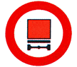 | Ρ-14 | Απαγορεύεται η είσοδος σε μηχανοκίνητο οχήμα, το οποίο σύρει ρυμουλκούμενο, πλήν ημιρυμουλκούμενου ή ρυμουλκούμενου ενός άξονα.Η αναγραφή αριθμού τόννων, είτε με λευκό χρώμα στο περίγραμμα του ρυμουκλκούμενου, είτε σε πρόσθετη πινακίδα, που τοποθετείται κάτω από την πινακίδα Ρ-14, σημαίνει ότι η απαγόρευση ισχύει μόνον άν το μέγιστο επιτρεπόμενο βάρος του ρυμουλκούμενου υπερβαίνει τον αριθμό αυτόν |  |